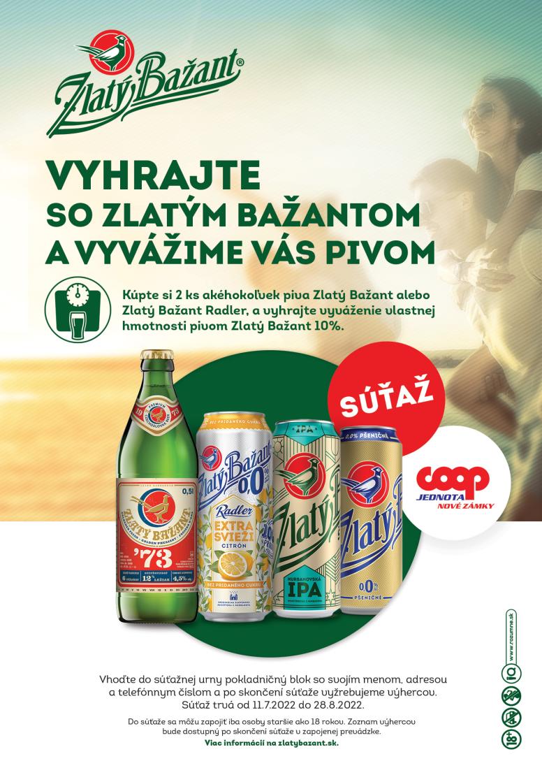 Kúpte si 2 ks piva Zlatý Bažant (akýkoľvek produkt v ľubovoľnej kombinácii) v sieti COOP Jednota Nové Zámky, s.d. Na zadnú stranu pokladničného bloku napíšte svoje kontaktné údaje (meno, priezvisko, adresa, telefónne číslo) a vhoďte ho do urny na to určenej v obchode. Čím viac blokov vhodíte, tým väčšiu šancu na výhru máte.