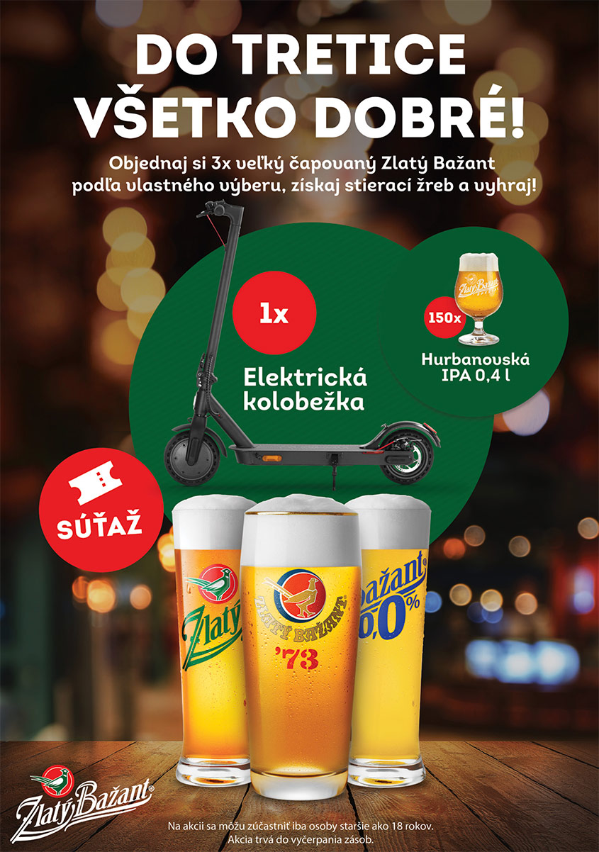 Kúpte 6 ks piva alebo Radlera Zlatý Bažant , zaregistrujte pokladničný blok so svojimi údajmi na www.copka.sk/zlaty-bazant-sutaz a vyhrajte zaujímavé ceny.